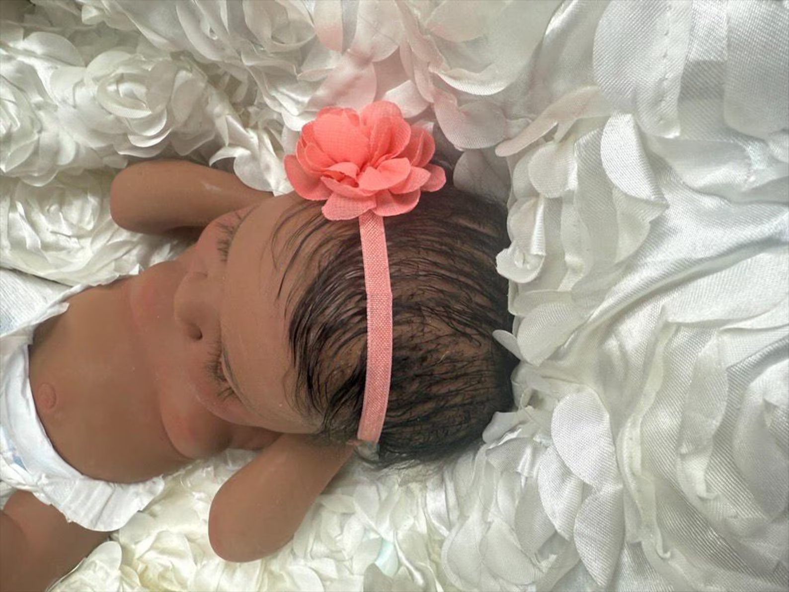 This Chunky Baby Girl is Painted and Lightly Rooted with Premium Quality, Sarah Silk hair in a beautiful black color. This baby has subtle mottling and beautiful soft newborn skintone. Baby Destiny is approx 19 inches long so a perfect newborn size baby. She will have a slight seam line which is reflected in her cost. This Chunky baby girl has a fully opened mouth for pacifier and bottle.